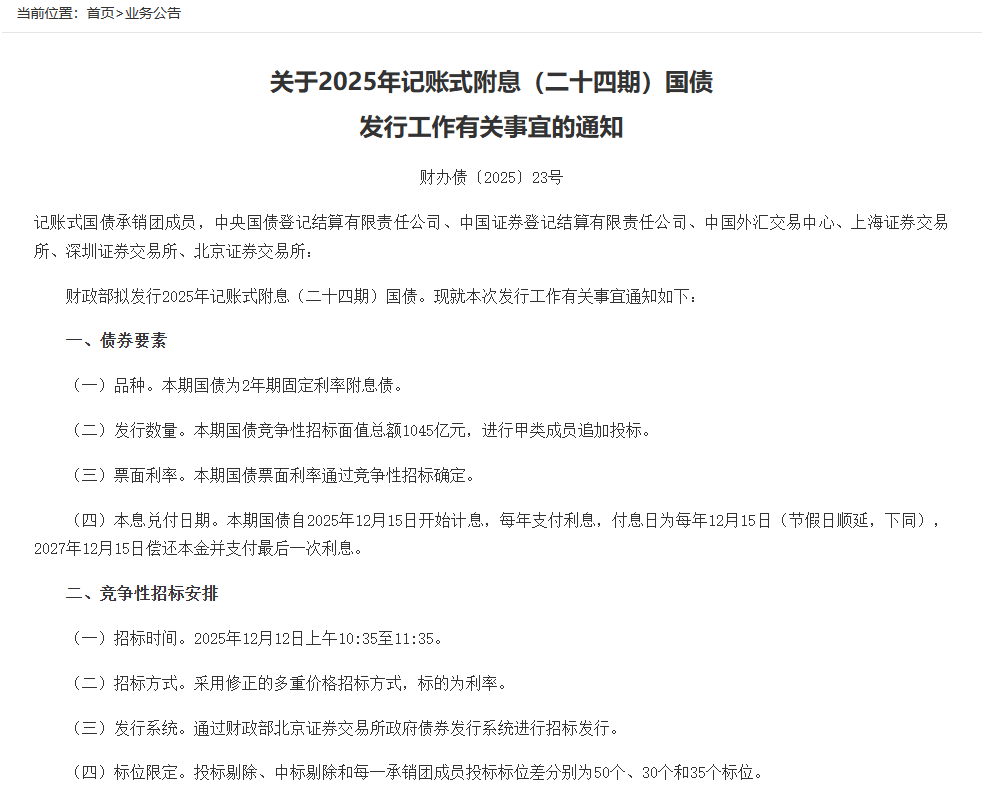 12月9日,财政部发布公告称,拟发行2025年记账式附息(二十四期)国债。本期国债为2年期固定利率附息债。本期国债竞争性招标面值总额1045亿元,进行甲类成员追加投标。本期国债票面利率通过竞争性招标确定。本期国债自2025年12月15日开始计息,每年支付利息,付息日为每年12月15日(节假日顺延,下同),2027年12月15日偿还本金并支付最后一次利息。招标时间为2025年12月12日上午10:35至11:35。