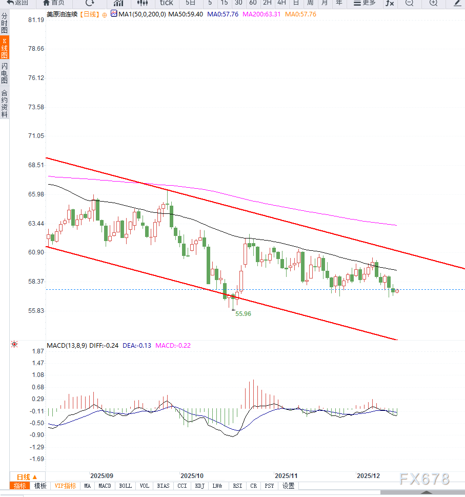 在趋势结构上,美原油仍运行在下降通道或宽幅震荡区间的下沿附近,尚未出现明确的趋势反转形态。均线系统方面,短期均线反复缠绕并略有下拐,中期均线对价格形成明显压制,限制了反弹空间。