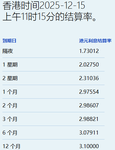 12月15日,港元拆息普遍向下,而与楼按相关的一个月拆息连跌两日报2.97554%,跌6.398基点;反映银行资金成本的三个月拆息报2.98821%,跌3.875基点。