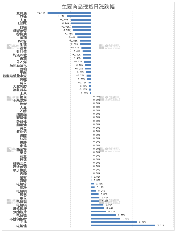 12月19日,卓创资讯监测商品现货市场15种上涨、24种下跌,23种企稳。有色金属板块领涨,电解镍涨3.11%居当日涨幅榜首,电解锡涨1.20%同步跟涨;黑色系板块多数品种企稳震荡运行,不锈钢板材涨1.40%,粗粉、线材微涨;能源化工板块多空交织,PTA涨2.22%,但PE、PVC等品种跌幅居前;农产品板块震荡偏弱运行,菜籽油跌2.11%领跌当日市场,豆油、大豆同步走弱,多数品种以下跌或企稳为主;贵金属板块走势分化,白银跌0.93%,黄金企稳。(价格涨跌幅均以卓创资讯监测现货商品均价或主流市场价格计算)
