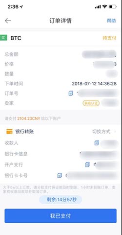 5. 进入支付详情页面,根据页面提示的卖家账号信息进行支付。确认支付成功后,点击“我已支付”,然后等待对方放币。