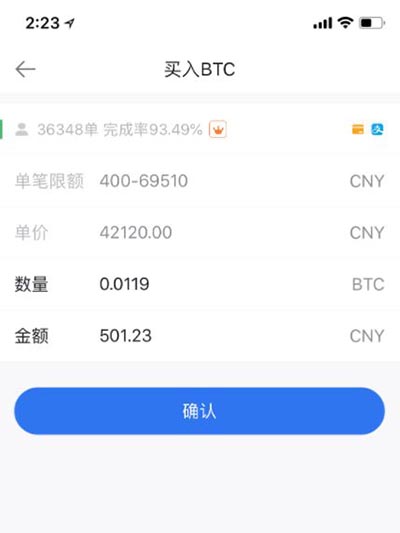 3. 点击“买入”后,进入“买入BTC”页面。可以查看商家的订单、完成率、支付方式和挂单信息。输入想要买入的数量和金额,然后点击“确认”。