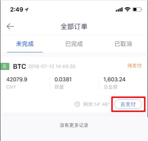 4. 确认后,点击“订单”,选择未完成订单,可以看到买入的订单信息。点击“去支付”。