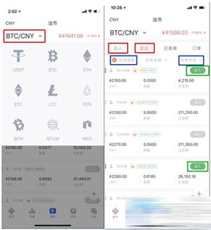 2. 在“买入”“卖出”页面选择BTC/CNY,可以查看所有挂单。根据需求选择“优质商家”和支付方式,选择合适的价位和商家,然后点击“买入”。
