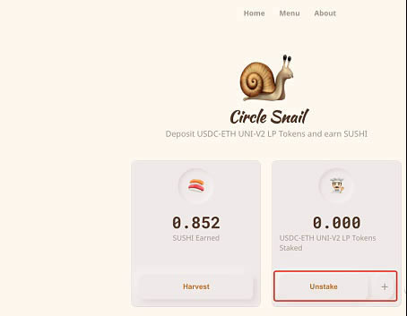- 将LP TOKEN放入页面,点击左边的"Harvest"提取SUSHI,点击右边的"Unstake"提取流动性。