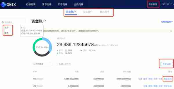 在操作界面上,资产管理-资金账户可以查看资金账户的充币和提币入口,以及资金账户的资产情况和各货币资产占比。资产管理-资金账户-资金划转可以进行资金划转操作,选择希望转入的目的账户,输入转入数量即可完成划转。资产管理-资金账户-资金记录可以查看充币、提币和资金划转的记录。